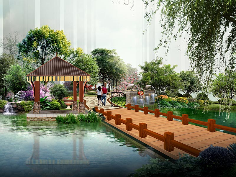 噴泉、神獸泉等多種水景景觀妝點(diǎn)園區(qū),賦予園區(qū)生動的氛圍和聲響;采用硬質(zhì)景觀點(diǎn)題,在主要節(jié)點(diǎn)設(shè)計(jì)神獸雕塑、花臺、燈飾、陶藝等小品突出東南亞特點(diǎn),