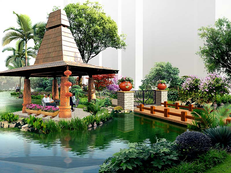 整個(gè)園區(qū)汲取東南亞風(fēng)情園林精華,以藝術(shù)的手法建造園林,純凈的空氣、養(yǎng)眼的蒼翠,再現(xiàn)東南亞休閑、悠然情調(diào)。將景觀與藝術(shù)進(jìn)行最大限度的融合,人